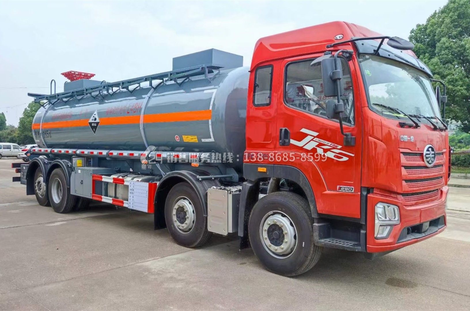 采用一汽青島解放JK6危險品專用底盤,JK6半高頂全浮駕駛室(空調/電動舉升/電動門窗/電動后視鏡),錫柴CA6DLD-29E6,陜齒9JS119A,457升級沖焊橋(速比4.444/鼓式制動),軸距:1900+4500+1350mm,295/80R22.5-18PR,其他:危化車罐式車專用底盤,多功能方向盤,空氣彈簧座椅,帶中間座椅,前橋爆胎應急安全裝置,前橋帶胎壓監(jiān)測,四軸輪胎帶爆胎應急及胎壓監(jiān)測裝置,排氣火花熄滅器,排氣管前置,帶發(fā)動機缸內制動,板簧3/3/2+-/8+-,4氣囊,帶國產ECAS,二軸帶橫向穩(wěn)定桿,400L鋁油箱,U型后處理器,鋁合金儲氣筒,150Ah蓄電池,連續(xù)工作取力器及控制機構,PKC線束,限速79KM/H,進口EBS/ESC/FCW/LDWS。顏色:解放紅金屬漆