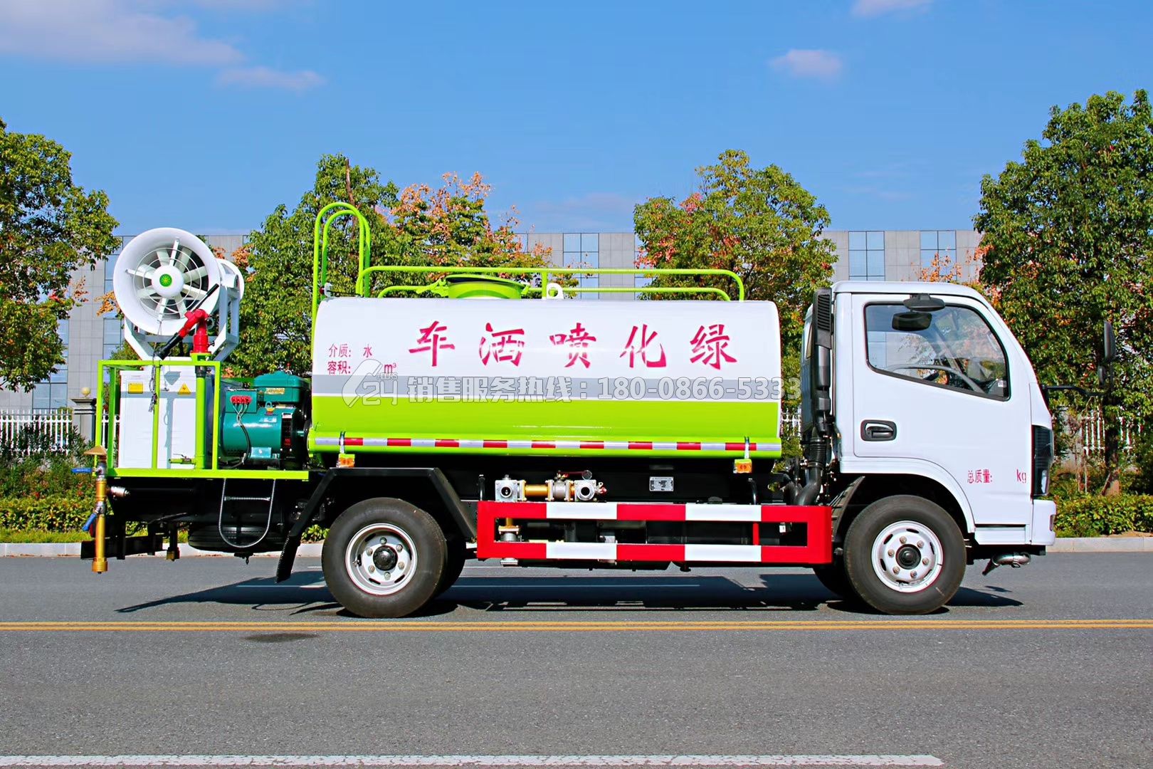 • 灑水車具有沖洗路面,澆灌園林,工地除塵,運(yùn)水、排水,應(yīng)急消防等功能。其標(biāo)配為前沖、后灑和側(cè)噴,采用自吸式專用水泵,泵可抽水排水,帶消防接頭、自流閥、罐體后帶工作平臺(tái),安裝綠化灑水炮,炮可旋轉(zhuǎn)可調(diào)節(jié)水量大小(噴射呈柱、霧、毛毛雨)。?可加裝15米到40米霧炮,加裝護(hù)欄清洗刷,除雪鏟,自動(dòng)電子水炮,打藥機(jī),保溫裝置等。