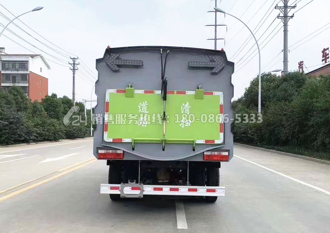 4、東風(fēng)8噸掃路車采用吸掃結(jié)合的方式收集垃圾,濕式除塵、電液控制,液壓傾翻卸料的作業(yè)方式對路面進行清掃作業(yè)。