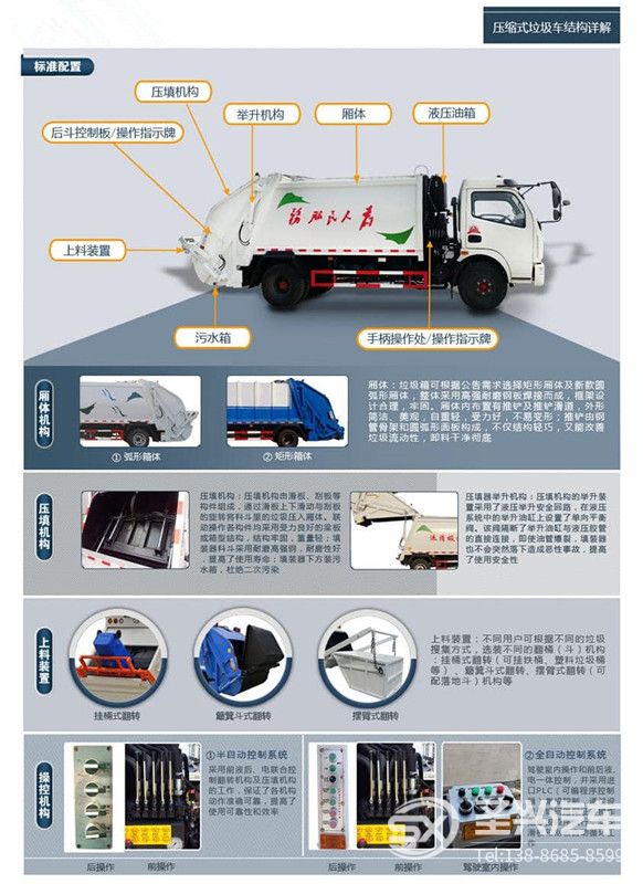 • 壓縮式垃圾車(chē)采用機(jī)電液一體化技術(shù),借助機(jī)、電、液聯(lián)合自動(dòng)控制系統(tǒng),通過(guò)車(chē)廂、填裝器和推鏟等專(zhuān)用裝置,實(shí)現(xiàn)垃圾倒入、壓碎或壓扁、強(qiáng)力裝填,把垃圾擠入車(chē)廂并壓實(shí)和推卸。其主要特點(diǎn)是垃圾收集方式簡(jiǎn)便、高效、具有自動(dòng)反復(fù)壓縮以及蠕動(dòng)壓縮功能,壓縮比高,裝載質(zhì)量大,作業(yè)自動(dòng)化,動(dòng)力性、環(huán)保性好,整車(chē)?yán)眯矢摺?/p>