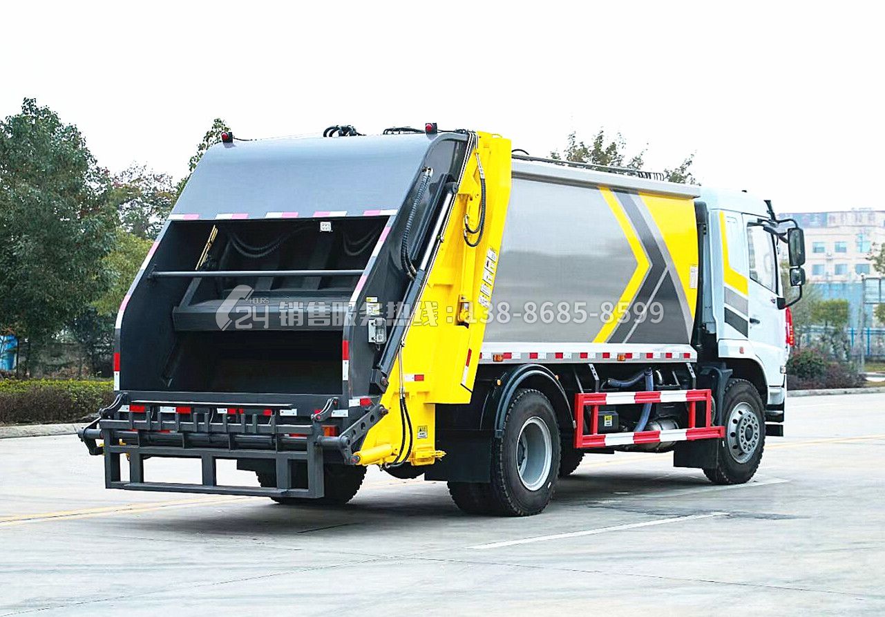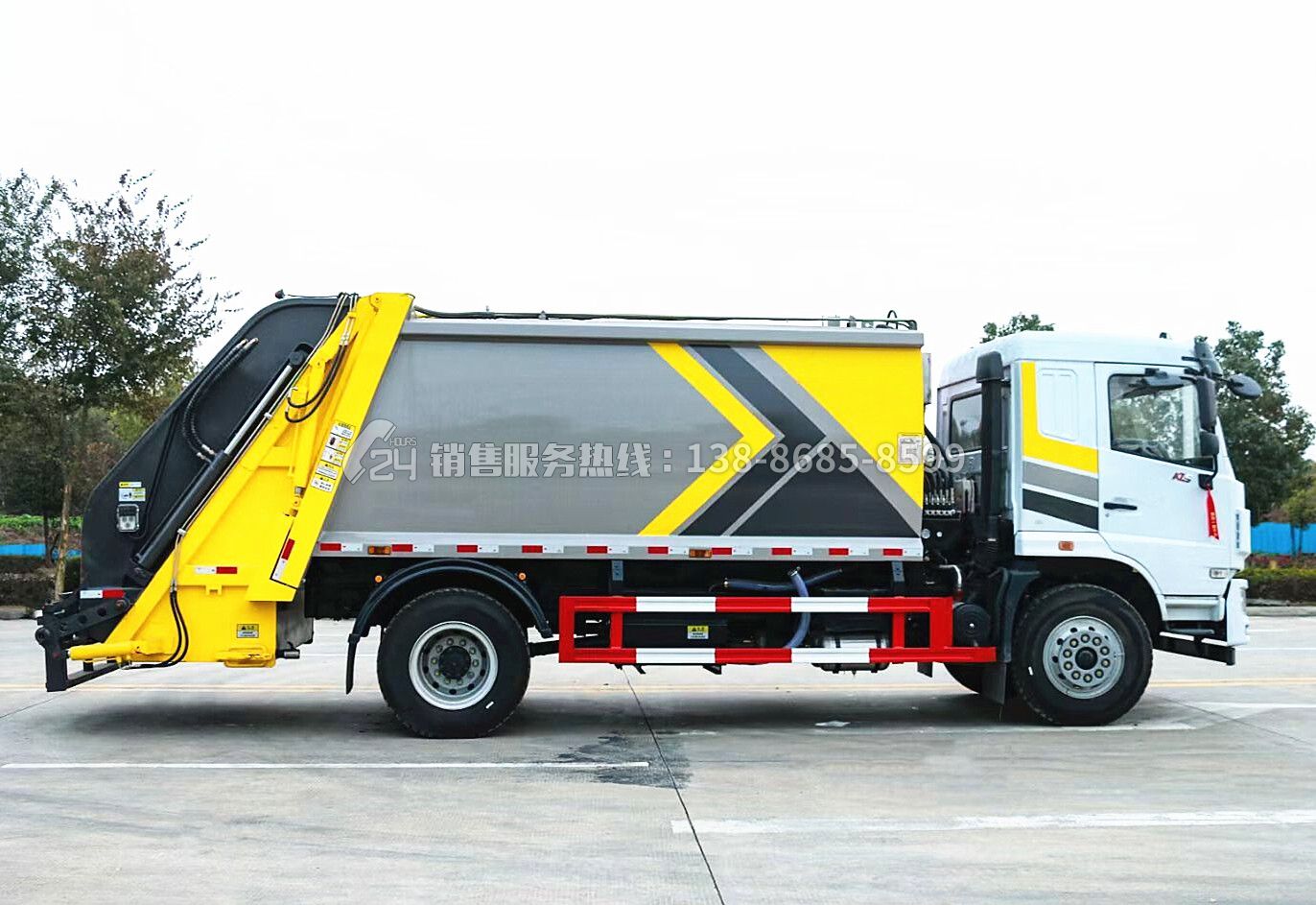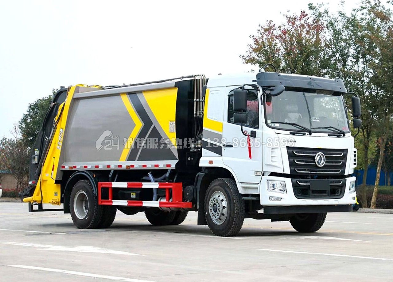 東風華神壓縮式垃圾車,由廂體、裝料機構(gòu)、壓縮機構(gòu)、卸料機構(gòu)、油泵、油缸、控制閥等組成的液壓機構(gòu)組成。廂體材料為優(yōu)質(zhì)碳鋼,厚度(單位:mm):邊4底5,廂體容積:12.0m3  ,裝料機構(gòu)由支架,連桿機構(gòu),凸輪,掛鉤等組成。在油缸作用下,將垃圾桶內(nèi)的垃圾自動翻轉(zhuǎn)倒入料斗內(nèi)。