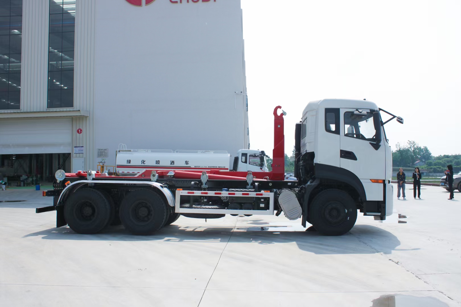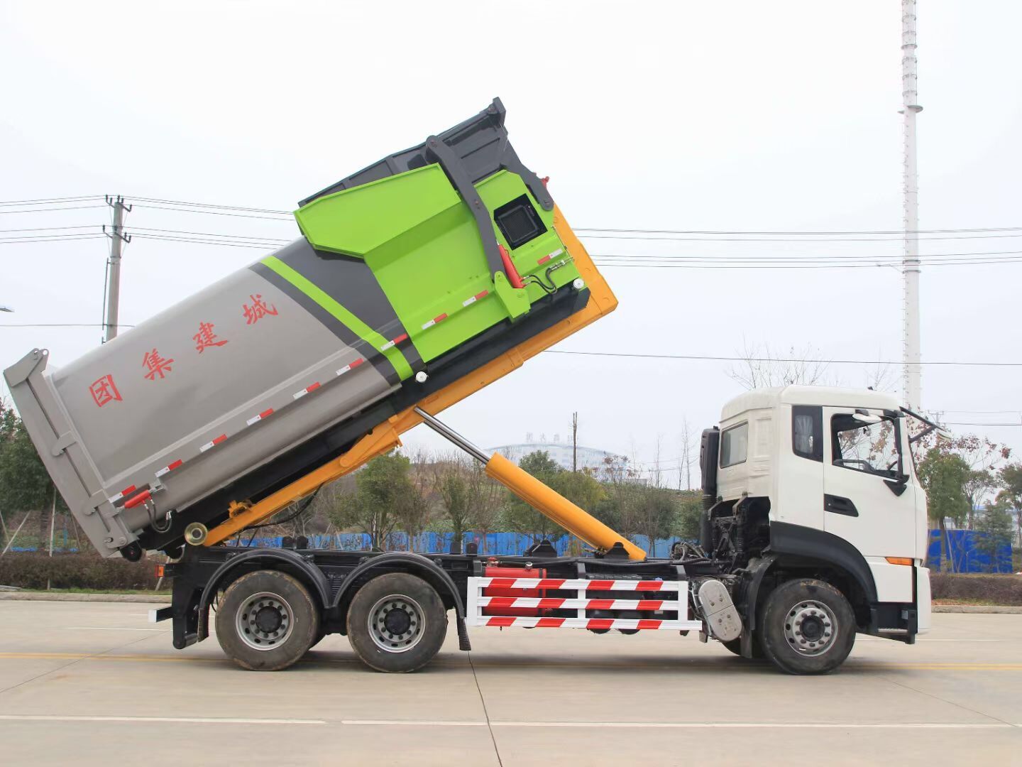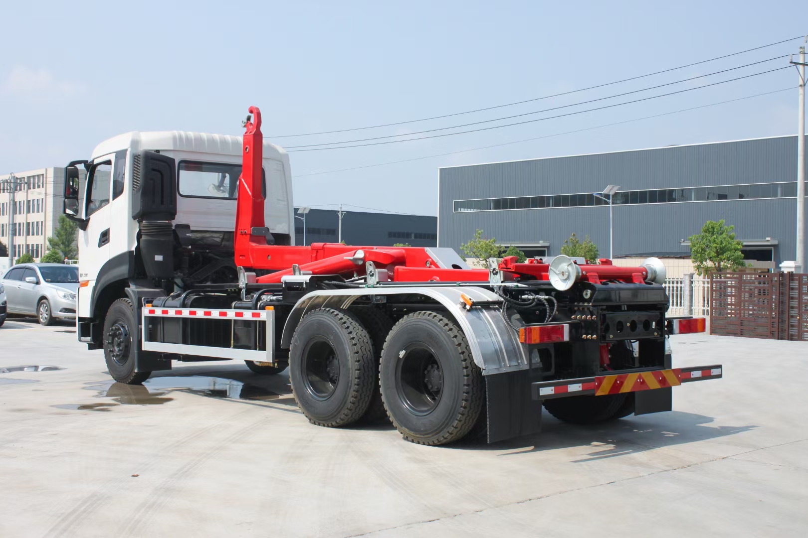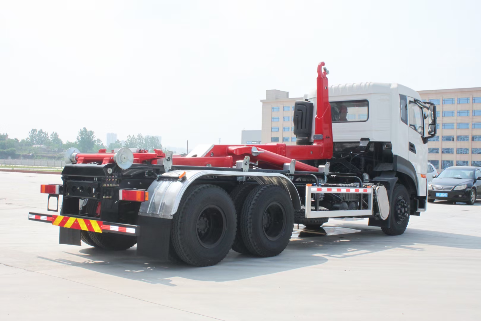東風天龍后雙橋鉤臂式垃圾車,標配可配合14-18方垃圾箱使用,也可配合同級別移動壓縮式垃圾箱使用,勾臂采用高強度優(yōu)質(zhì)錳鋼,副車架采用16號低合金槽鋼、20號方管與8mm、5mm、4mm、16Mn鋼板焊接而成,翻轉(zhuǎn)架與活動勾臂垃圾車動作設計合理可靠,實現(xiàn)拉箱、鎖緊、放箱和自卸操作簡單方便,控制方式為駕駛室智能控制,也可根據(jù)用戶需要選裝駕駛室外傳統(tǒng)操作桿進行控制。