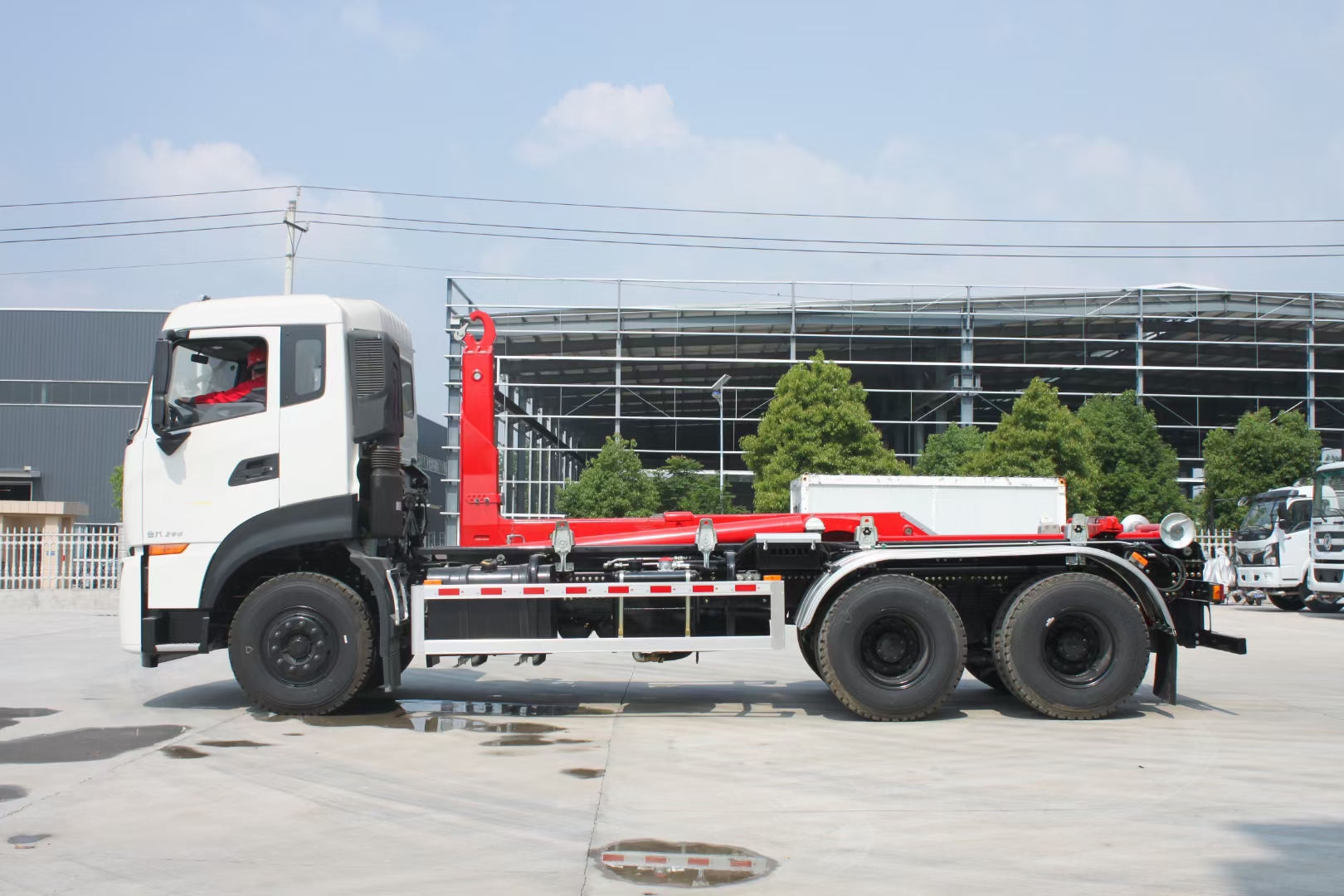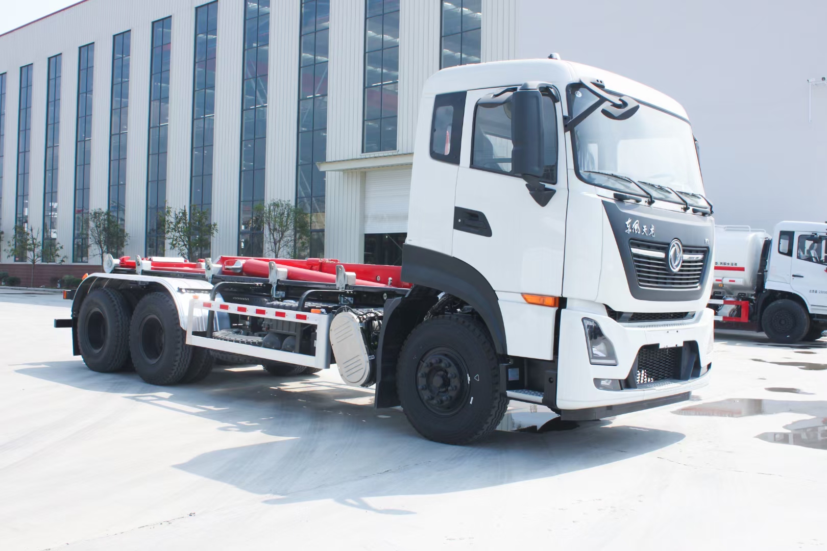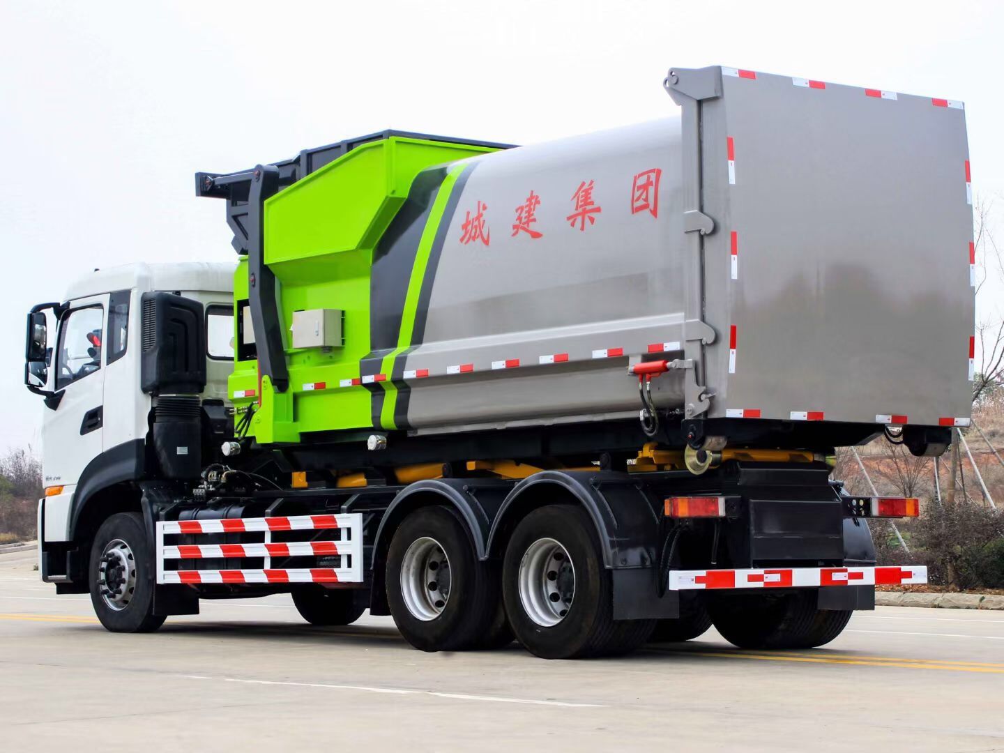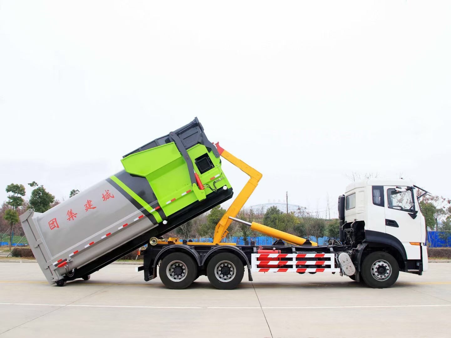 東風天龍后雙橋鉤臂式垃圾車,標配可配合14-18方垃圾箱使用,也可配合同級別移動壓縮式垃圾箱使用,勾臂采用高強度優(yōu)質(zhì)錳鋼,副車架采用16號低合金槽鋼、20號方管與8mm、5mm、4mm、16Mn鋼板焊接而成,翻轉(zhuǎn)架與活動勾臂垃圾車動作設計合理可靠,實現(xiàn)拉箱、鎖緊、放箱和自卸操作簡單方便,控制方式為駕駛室智能控制,也可根據(jù)用戶需要選裝駕駛室外傳統(tǒng)操作桿進行控制。