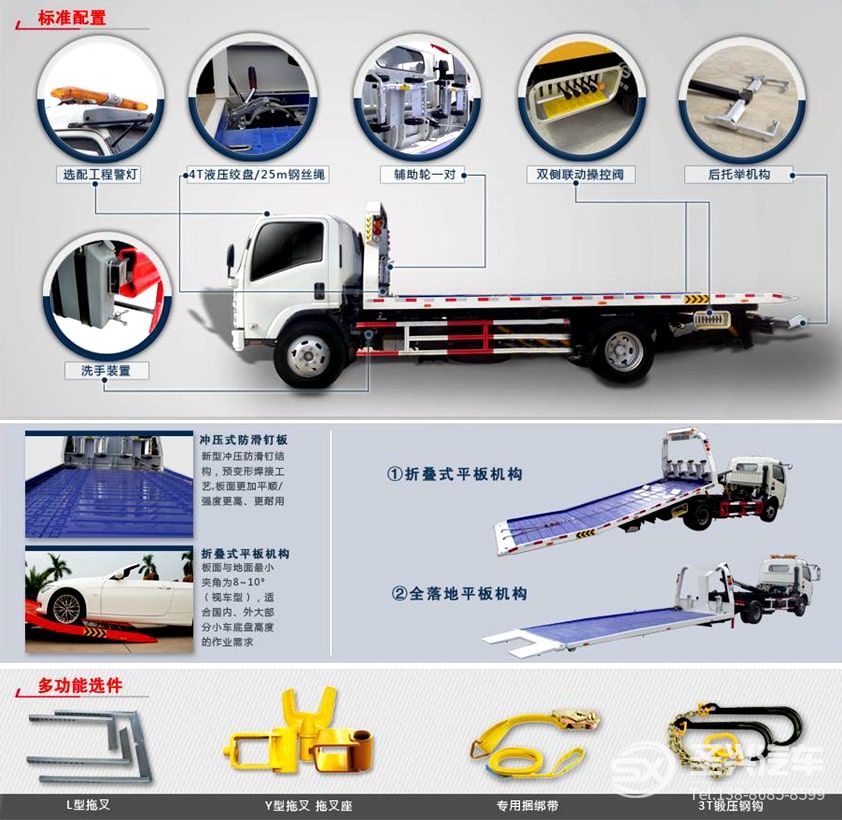 平板長4.2米(可選伸縮板或折疊板上裝),寬2.3米。背4噸,后托臂可托舉2噸。