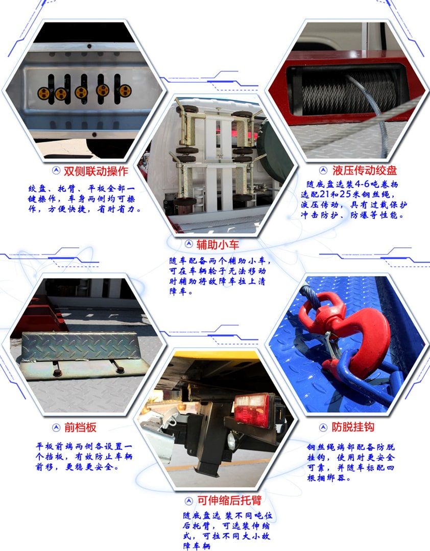 上裝配置:平板長6.1-6.35米(可選伸縮板上裝),寬2.3米。背6噸,后托臂可托舉2噸。