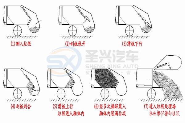 壓縮式垃圾車裝滿垃圾后垃圾箱完全處于封閉狀態(tài),在轉(zhuǎn)運(yùn)途中不會(huì)污染環(huán)境。垃圾車在處理(或填埋)場卸出垃圾時(shí),先舉起填裝器,敞開垃圾箱后端,原停于垃圾箱前端的推鏟向后移動(dòng),沿水平方向,把垃圾箱里的垃圾推出。垃圾卸料見圖一中步驟(7)。1