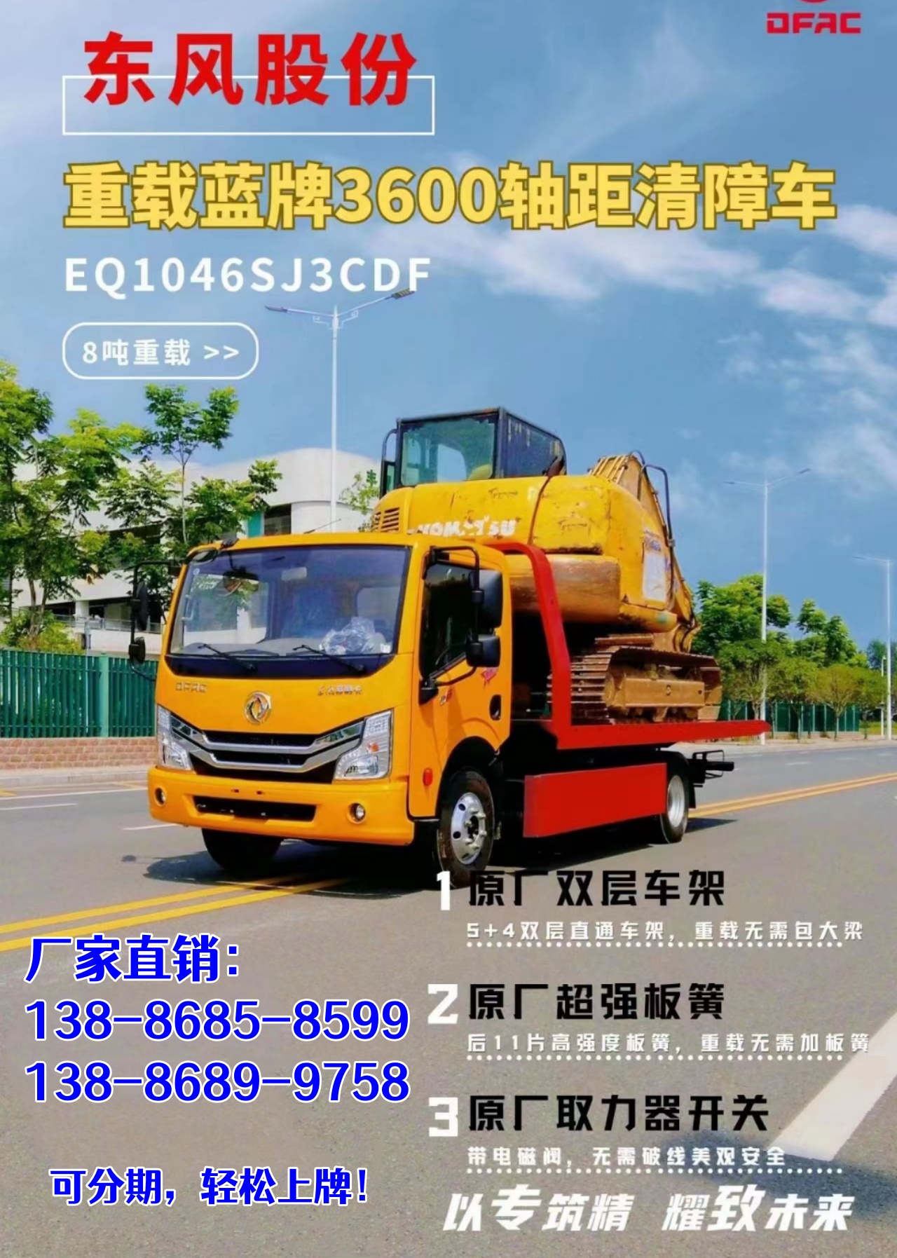 ★詳細(xì)配置: 方向助力,斷氣剎,原廠空調(diào),電動(dòng)玻璃,中控鎖,遙控鑰匙,多功能方向盤,定速巡航,鋁合金輪輞,鋁合金氣室,鋁合金傳動(dòng)軸,高密度材料油箱100升,ABS,OBD,T-BOX,原廠取力器開關(guān)及電磁閥。