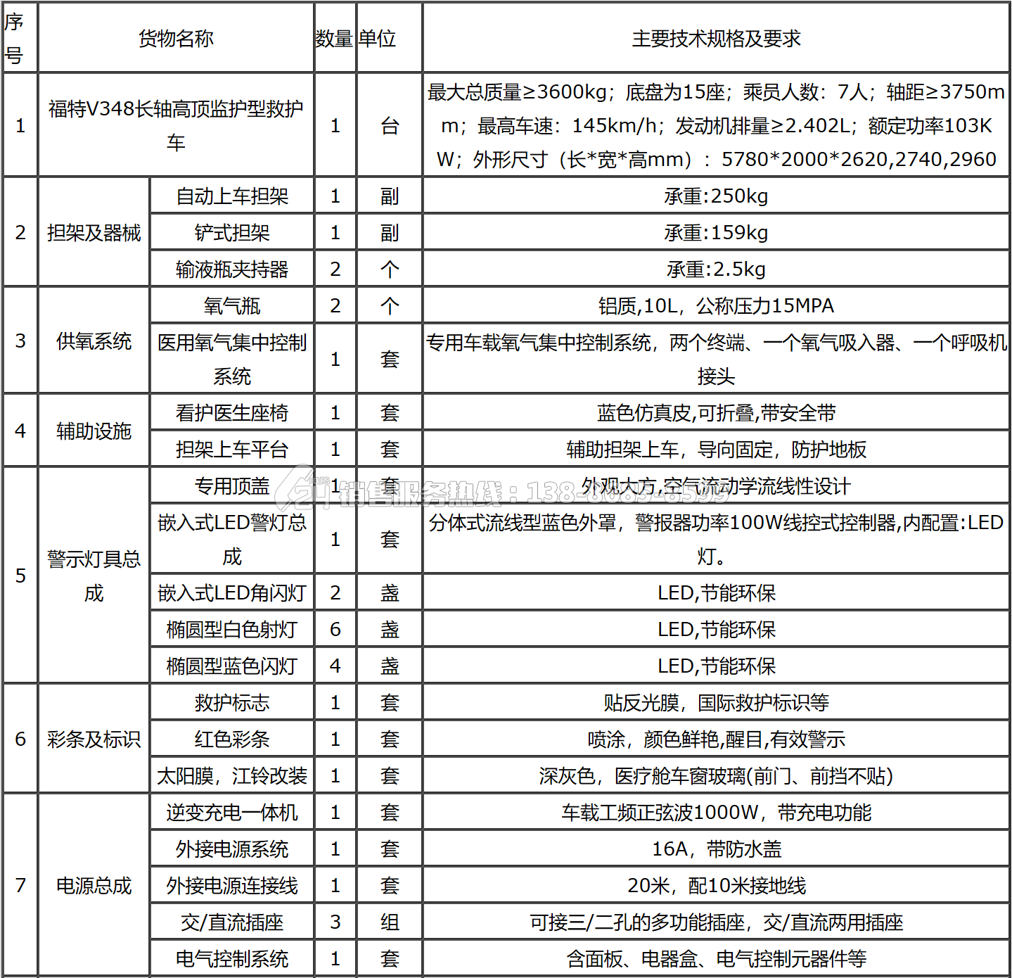福特V348救護(hù)車超人長(zhǎng)軸高頂監(jiān)護(hù)型主要技術(shù)規(guī)格和改裝配置: