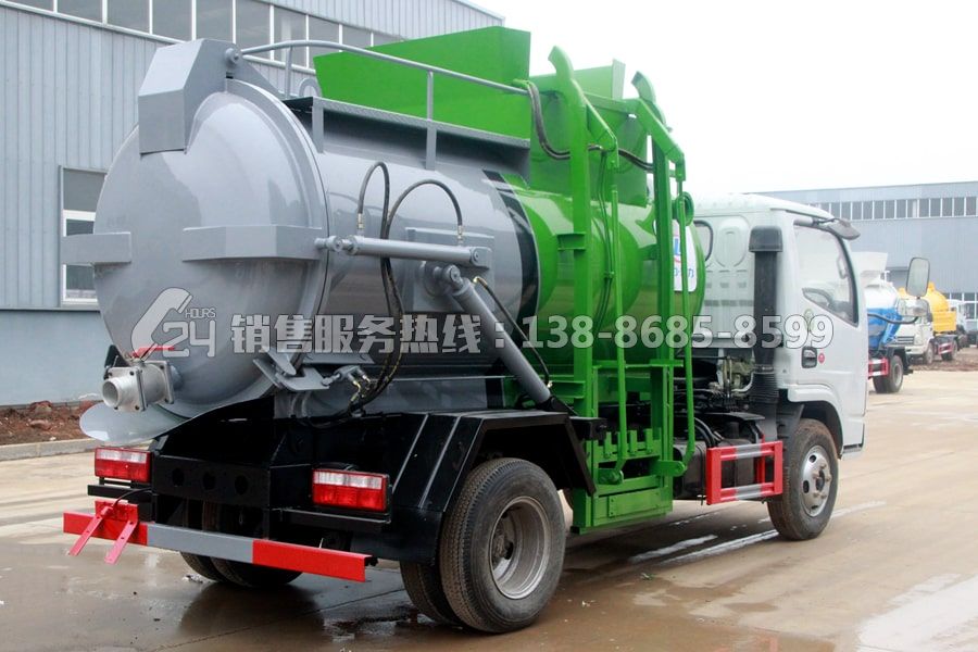 罐體采用5mm厚碳鋼板一次性卷壓而成,罐體容積為4.5立方米,罐體內(nèi)部可加裝推板(推板卸料,勸退布袋自卸功能),油泵、多路閥、油缸等配置齊全,液壓舉升卸料,垃圾桶提升系統(tǒng)是將廚房?jī)?nèi)的垃圾桶放在提升機(jī)上,由油缸驅(qū)動(dòng)通過(guò)拉桿裝置機(jī)構(gòu)實(shí)現(xiàn)倒料和復(fù)位,將垃圾投進(jìn)垃圾罐內(nèi)。提升機(jī)與進(jìn)料口結(jié)合,可游有效防止溢灑、遺漏。車輛左邊有操縱桿,可操作后門開關(guān)、罐體舉升、掛桶舉升等系統(tǒng),操作便捷。