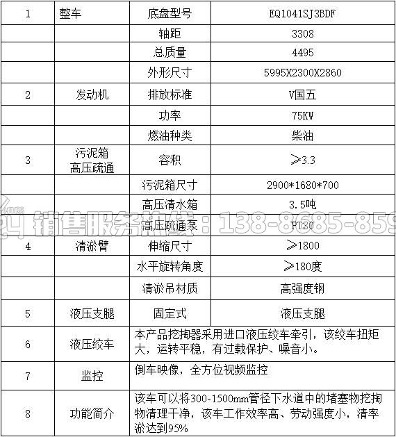 正宗國(guó)五朝柴發(fā)動(dòng)機(jī),動(dòng)力轉(zhuǎn)向,ABS,尿素罐,7.00鋼絲胎??傎|(zhì)量:4495。貨廂后部:采用固定式斜坡設(shè)計(jì),車輛配備專用挖掏器,液壓管帶鋼絲,耐高壓,進(jìn)口多路閥,配備3.5方水箱,帶高壓疏通功能,原裝意大利HPP進(jìn)口高壓泵壓力:13MPA,配備φ13高壓管,挖掏器最長(zhǎng)工作80米,操作方式:全遙控操作、全車作業(yè)監(jiān)控、倒車影像。