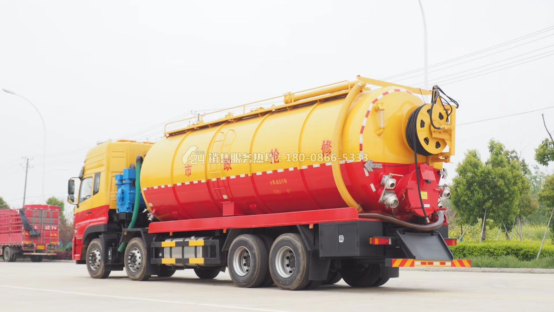 東風(fēng)天龍前四后八清洗吸污車 前四后八吸污車上裝配置:罐體采用8mm碳鋼制作,罐體有效容積為34.0立方(罐體尺寸為直線段7100*2350,其中清水罐長(zhǎng)2600,污水罐長(zhǎng)4500),外部采用4根63號(hào)槽鋼為加強(qiáng)筋,水罐約10立方,吸污罐約24.0立方。直焊縫,不接。100升副油箱,中置雙頂,315流量天津通潔高壓清洗泵,10個(gè)噴頭,60米高壓管,后封頭后蓋為小蓋用液壓開(kāi)啟直徑600,小蓋加裝可固定螺帽,小蓋旁兩個(gè)自留閥120mm,操作箱為卷閘門封閉式,帶兩個(gè)視糞窗,洗手裝置,洗污管一根。山東濰柴420馬力發(fā)動(dòng)機(jī),SK-42山東濰坊水循環(huán)真空泵,防溢流閥門。