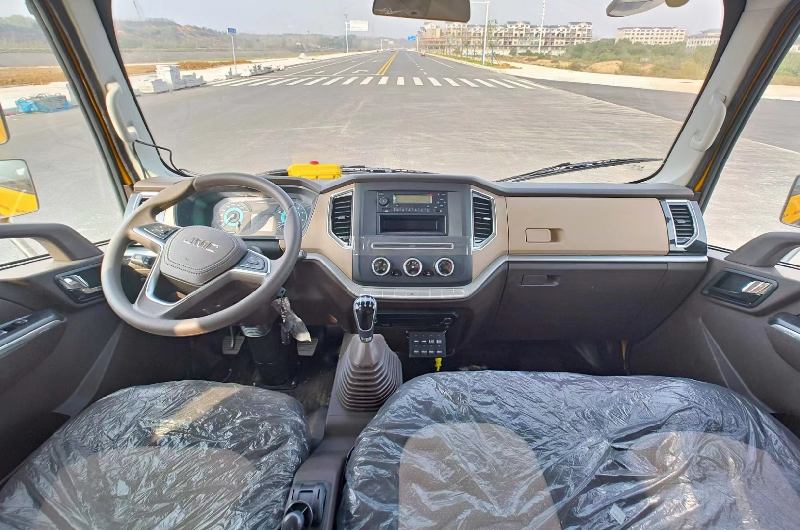 該車采用江鈴凱運國六專用輕卡底盤,凱運系列專用雙排寬體駕駛室,江鈴122馬力柴油發(fā)動機,5檔手動變速箱,3360mm軸距,7.00R16鋼絲胎,方向助力、離合助力、ABS防抱死系統(tǒng)、氣剎制動,原廠空調(diào)。