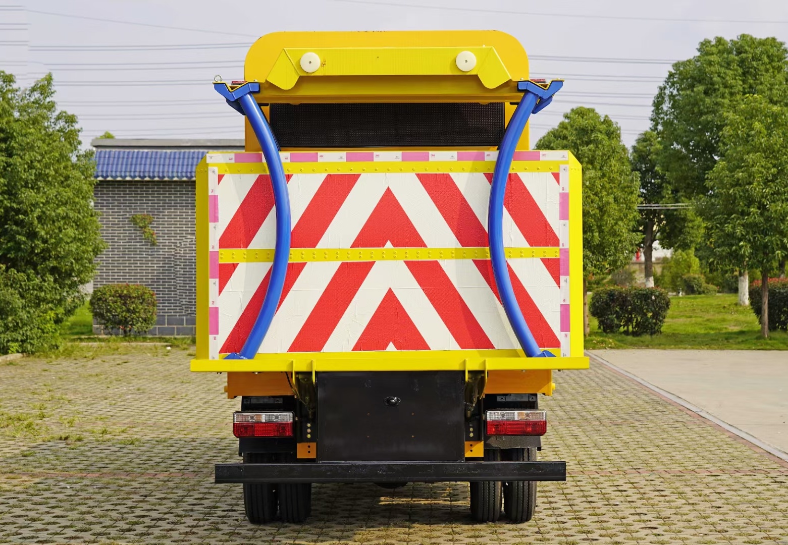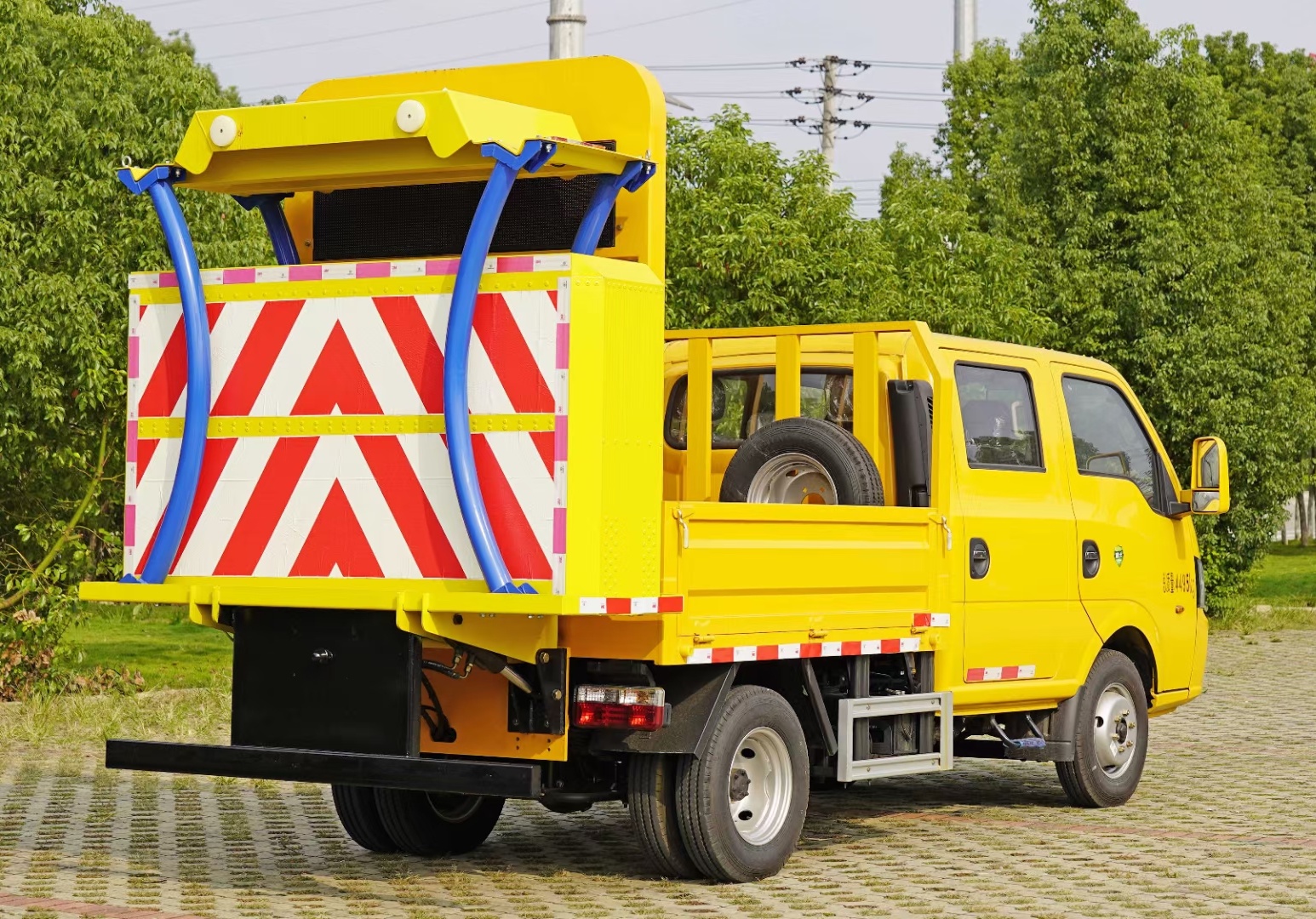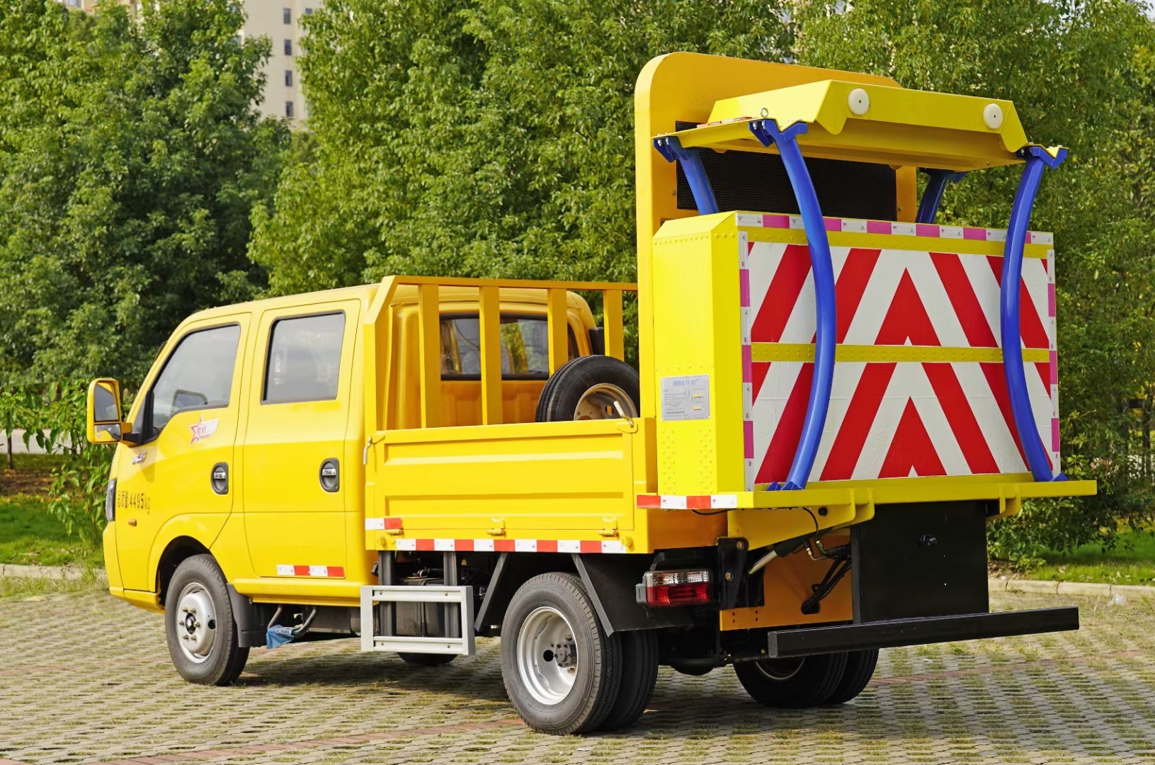 上裝采用Q235國(guó)標(biāo)邊3mm底板花紋板4mm厚,箱體后部防撞緩沖模塊包采用國(guó)際知名技術(shù)產(chǎn)品70K防撞緩沖模塊,防撞緩沖吸能模塊主要由車載防撞緩沖墊和導(dǎo)向標(biāo)志架組成,可充當(dāng)施工作業(yè)車輛后方的緩沖衛(wèi)士。