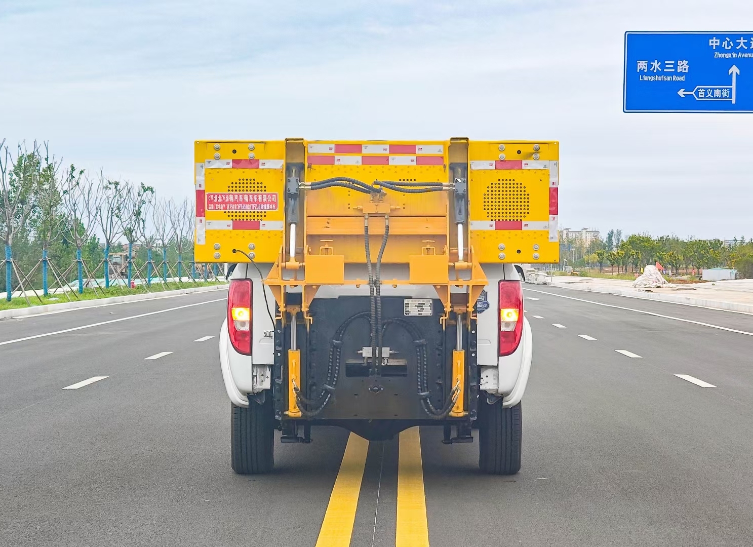 上裝采用Q235國(guó)標(biāo)邊3mm底板花紋板4mm厚,箱體后部防撞緩沖模塊包采用國(guó)際知名技術(shù)產(chǎn)品70K防撞緩沖模塊,防撞緩沖吸能模塊主要由車載防撞緩沖墊和導(dǎo)向標(biāo)志架組成,可充當(dāng)施工作業(yè)車輛后方的緩沖衛(wèi)士。