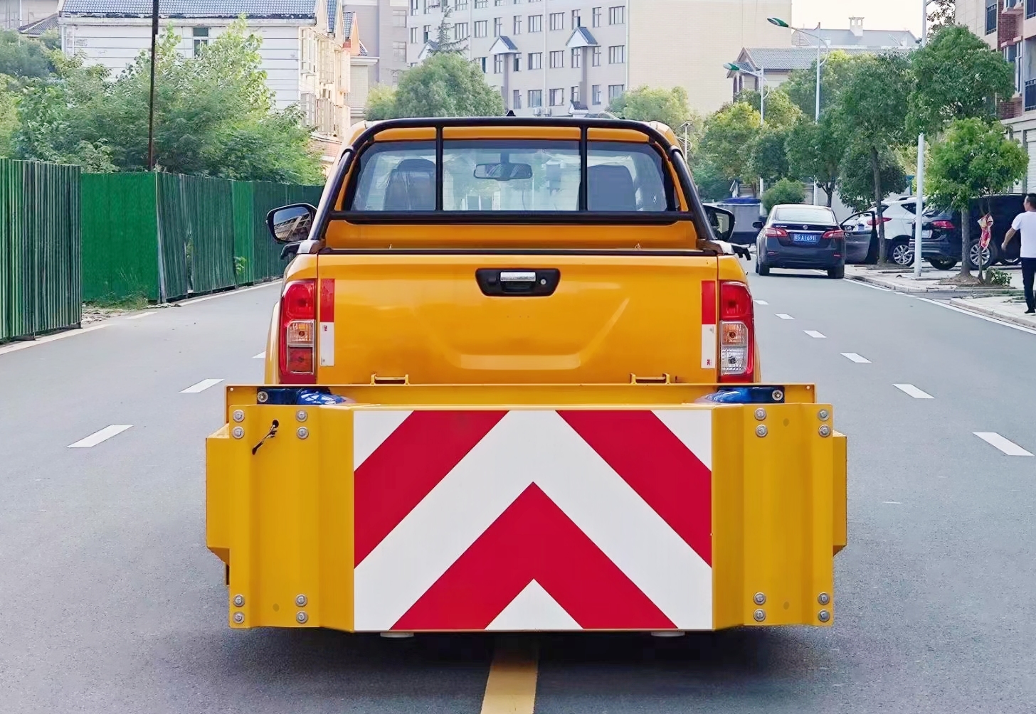 上裝采用Q235國標邊3mm底板花紋板4mm厚,箱體后部防撞緩沖模塊包采用國際知名技術(shù)產(chǎn)品70K防撞緩沖模塊,防撞緩沖吸能模塊主要由車載防撞緩沖墊和導向標志架組成,可充當施工作業(yè)車輛后方的緩沖衛(wèi)士。