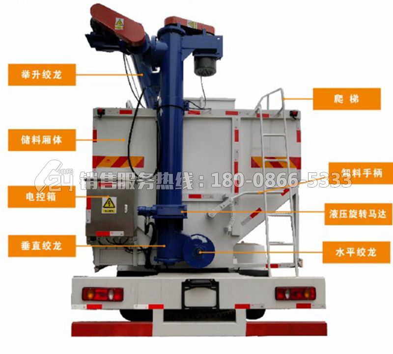 • 散裝飼料運輸車主要用于從飼料廠向畜牧場養(yǎng)禽場及飼料加工用戶運輸散裝飼料成品或飼料生產(chǎn)原糧,同時它也可用來運輸某些無腐蝕性粉粒狀原料,如制藥廠粉料和糧庫周轉(zhuǎn)。散裝飼料車的飼料罐架設在卡車的底盤上,罐頂開有進料口 頂部的一根螺旋輸送卸料管(俗稱卸料絞龍)則可自由回轉(zhuǎn)和抬升,抬升的仰角可達60度。運輸時,頂部的螺旋管平臥在罐頂;卸料時則抬起,使管端的出料口與畜禽飼養(yǎng)場貯料罐頂部的進料門相接,駕駛室內(nèi)裝有操縱裝置(操縱裝置也可裝置在罐體尾部),卸料時通過車底的動力輸出軸和減速器來驅(qū)動螺旋,以完成卸料。