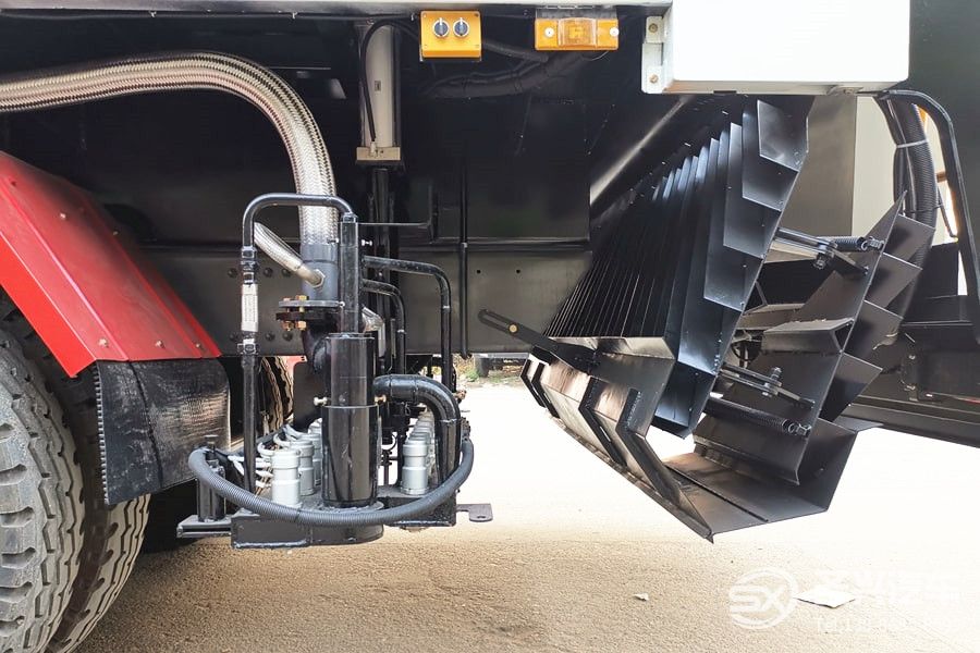 料倉內安裝有內影藏式中置頂翻轉軸采用通軸保證料倉升起的平穩(wěn)性;料門為16路控制,采用了角度螺旋角度控制儀,要使料門達到某個開度,可在角度控制儀上設置料門打開角度,非常方便,準確。有效調整撒布均勻度,改變了傳統(tǒng)石料撒布不均的情況;分料板和下料板的調節(jié)范圍大,適用不同規(guī)格(S3~S24mm)的石料。
